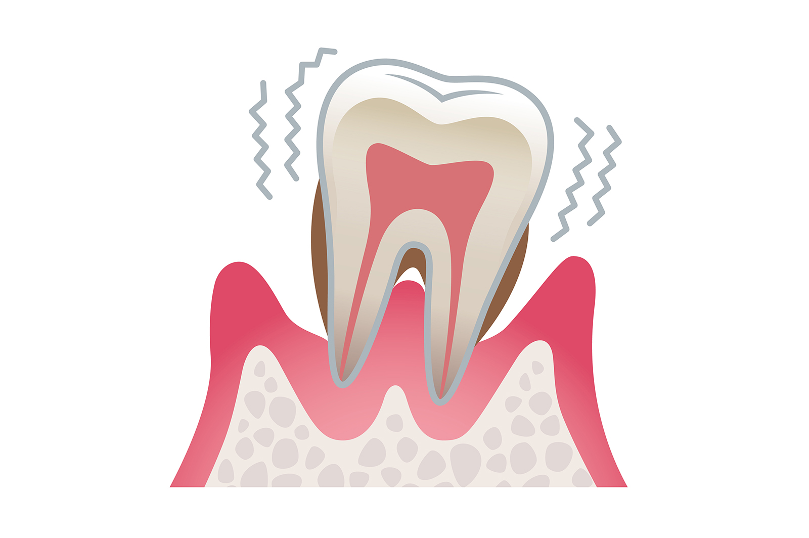 奥歯は複数の根に分かれています。重度の歯周病が進行すると、歯の根の周囲の骨が失われてしまいます。その結果、歯の根の分かれ目が露出しやすくなり、そこに歯石が付着してしまいます。このような状態になると、通常の方法では歯石を除去することが難しくなります。