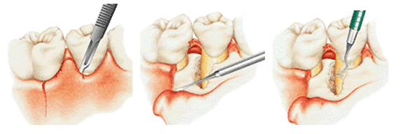 「FOP法」は、歯周ポケットの奥深くに溜まった歯石を取り除くための治療です。まず、歯ぐきを切り開き、蓄積された歯石をしっかりと除去します。その後、切開した部分を縫合します。このようにして歯石や汚れを取り除くことで、炎症が回復し、歯周ポケットは徐々に浅くなります。